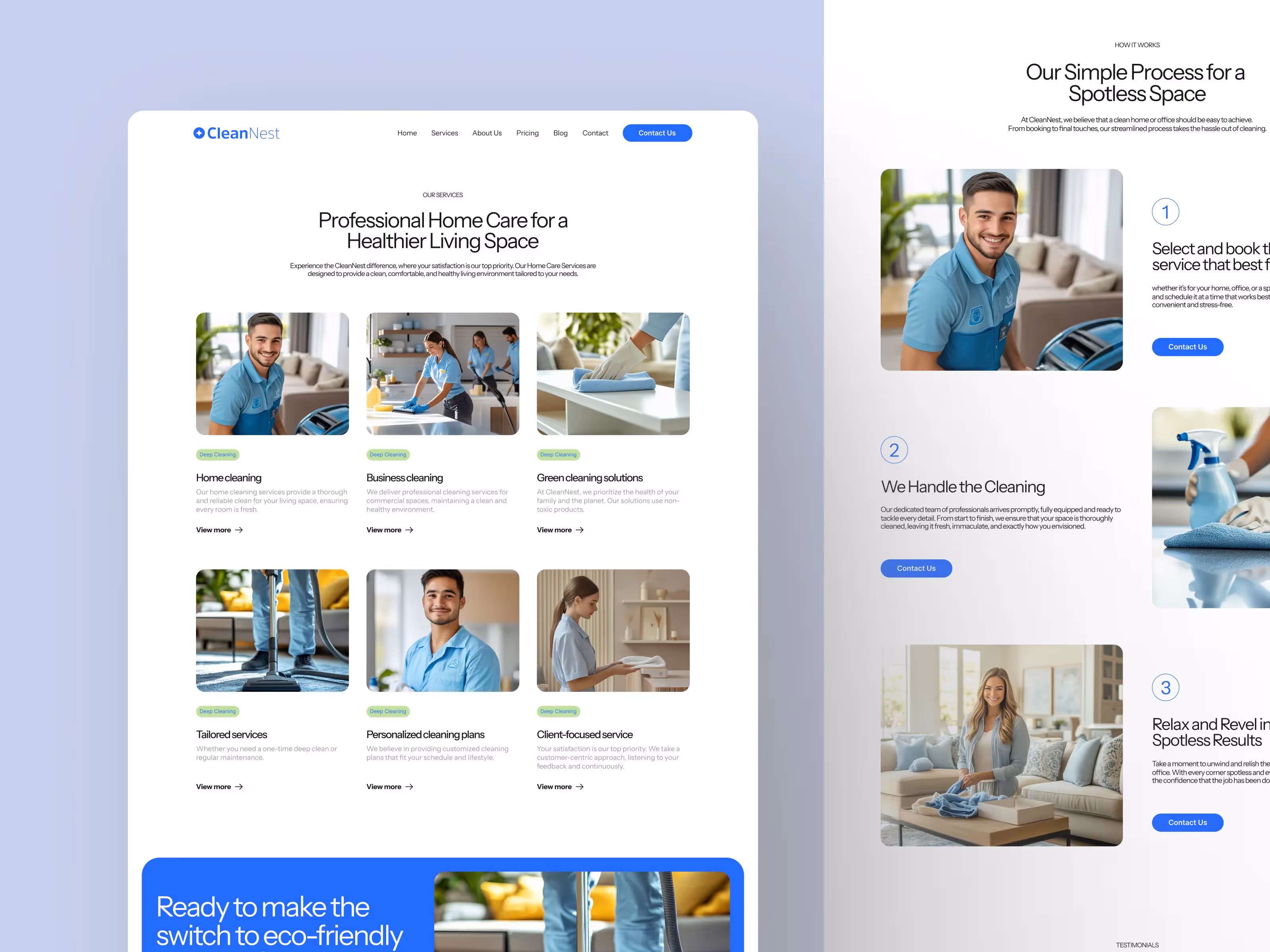 Ninho limpo é um modelo Webflow projetado especificamente para profissionais de serviços de limpeza e empresas que desejam estabelecer uma presença on-line moderna e confiável. Perfeito para serviços de limpeza residenciais, comerciais e especializados, Ninho limpo oferece uma estrutura flexível e personalizável, permitindo que você adapte facilmente todos os componentes para atender às suas necessidades comerciais.