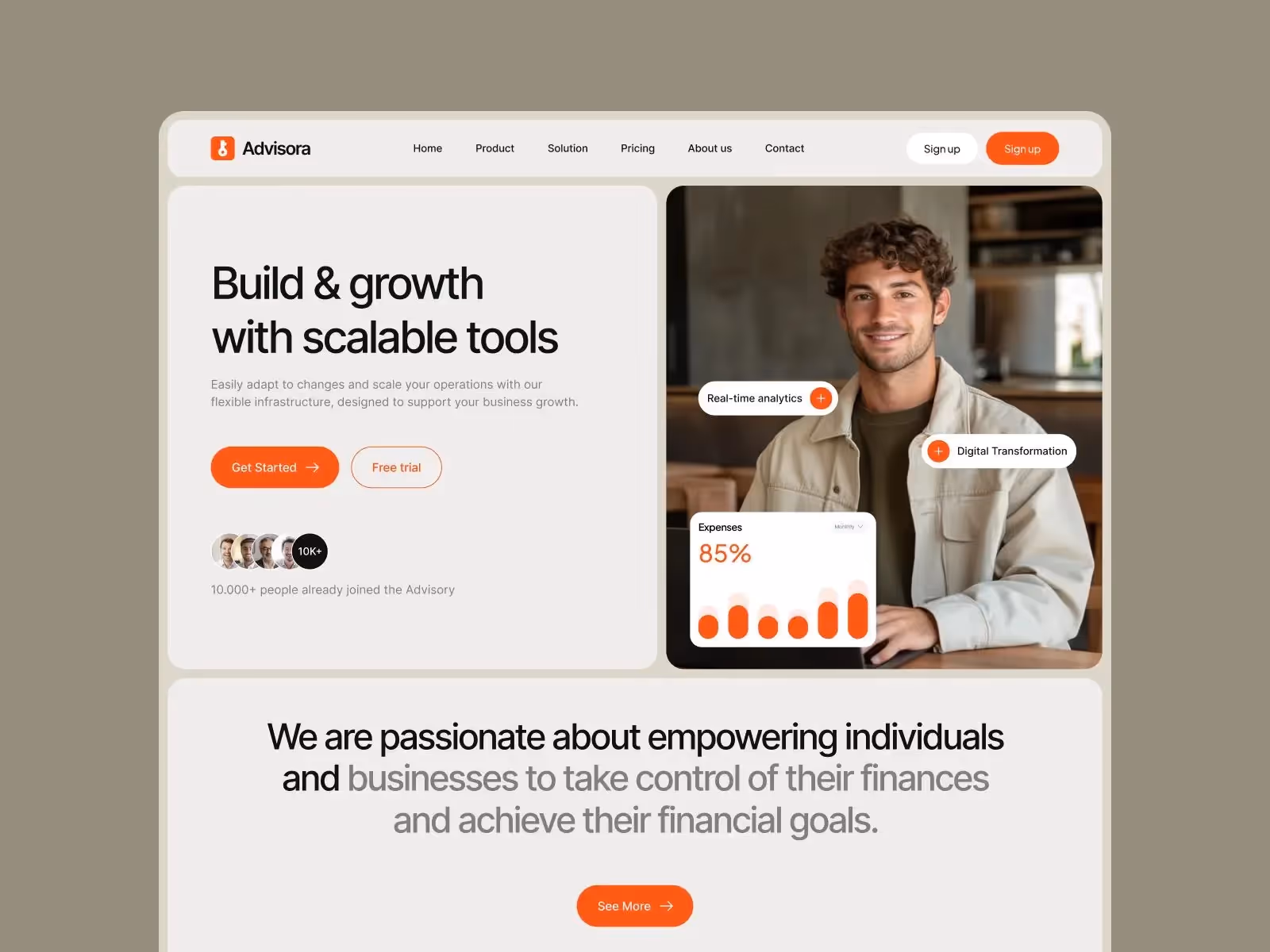 Le modèle comprend des outils de commerce électronique intégrés et une page de tarification dédiée, ce qui permet aux formateurs de proposer facilement des forfaits, des adhésions et des programmes spécialisés [4]. Que vous vendiez des plans d'entraînement, des guides nutritionnels ou des séances de coaching haut de gamme, Advisora simplifie le processus. De plus, son design personnalisable vous permet d'aligner chaque aspect sur votre marque, garantissant ainsi une expérience professionnelle et fluide aux clients.