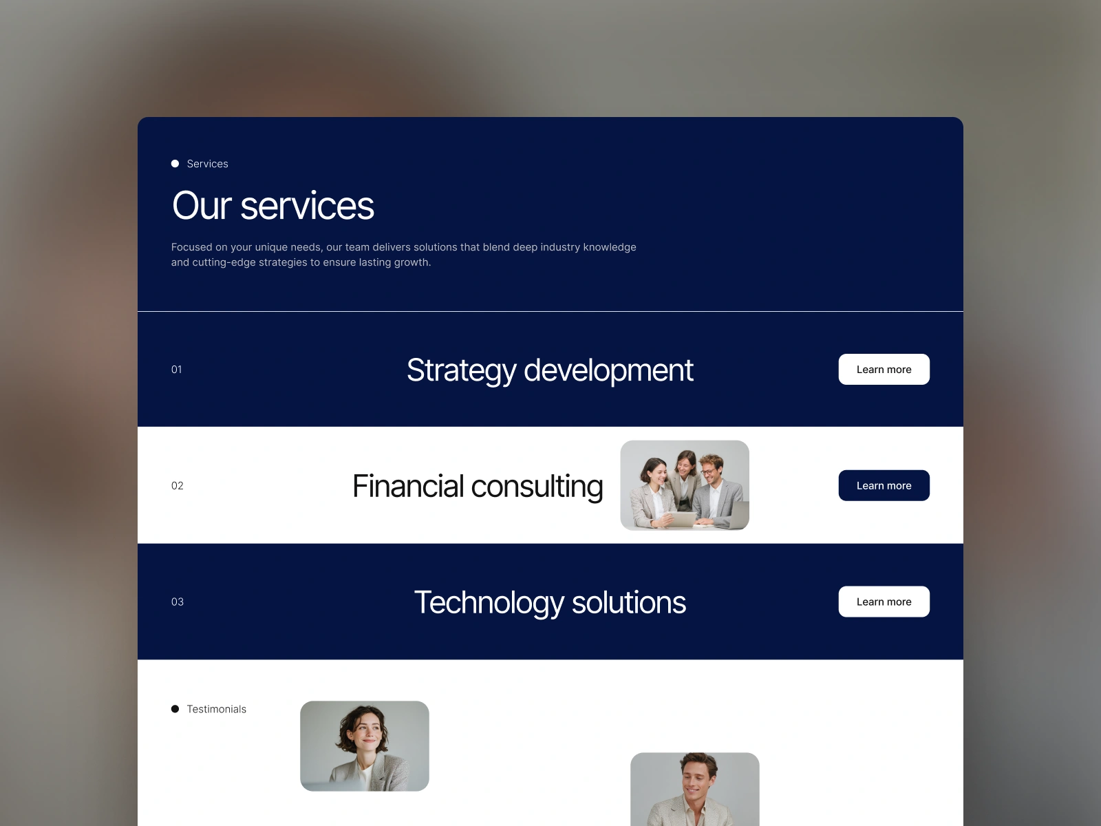 Key sections include strategy development, financial consulting, and technology solutions, each with detailed descriptions and imagery. Testimonials add credibility, while the contact section encourages engagement.
