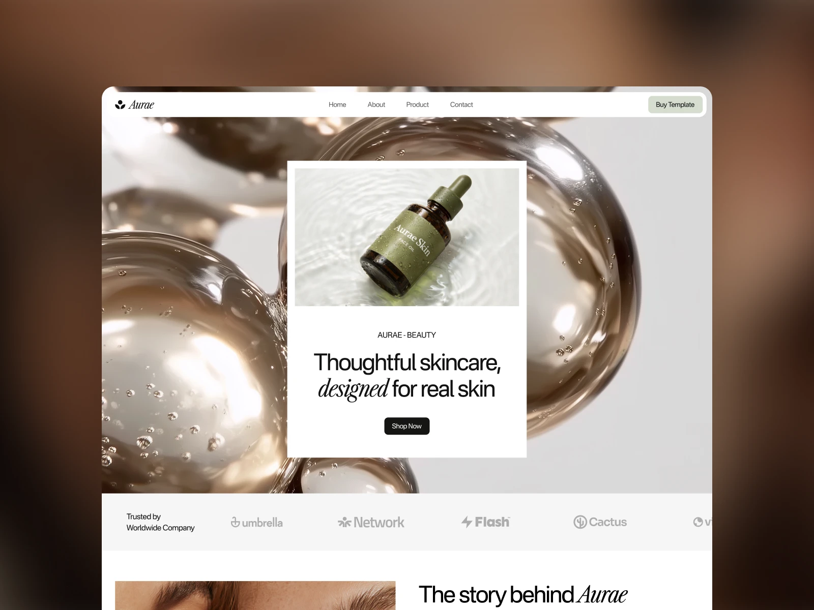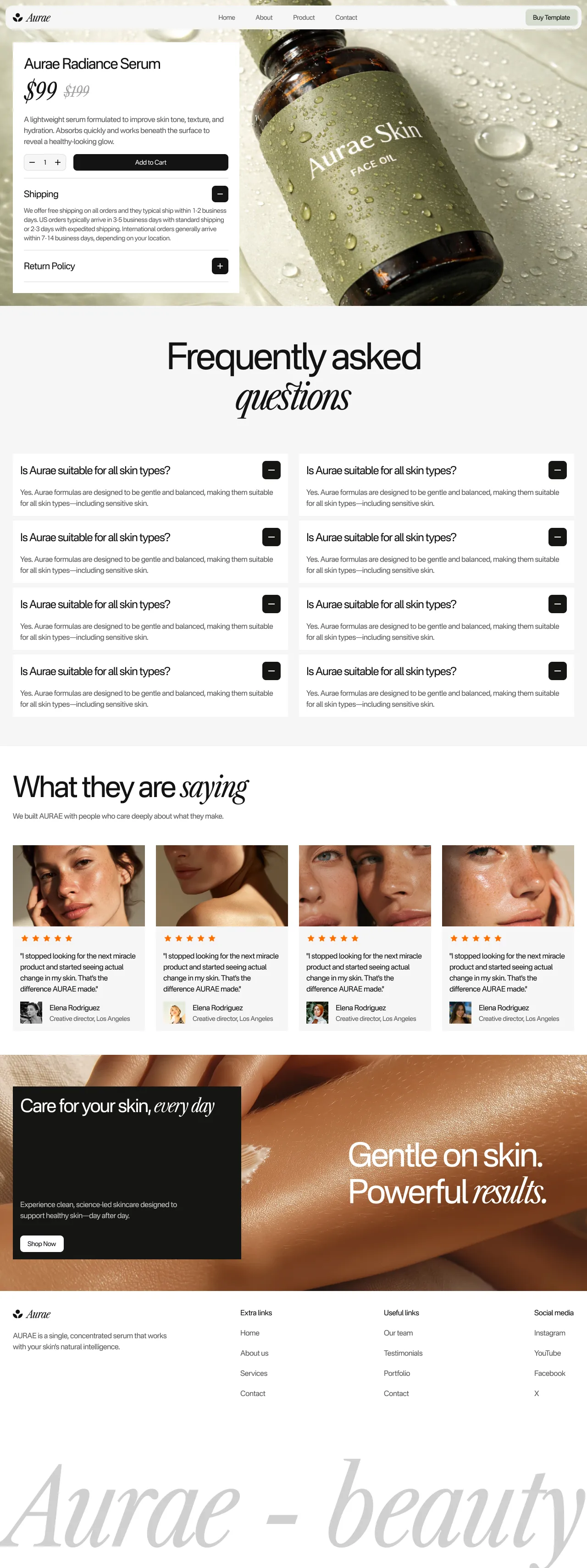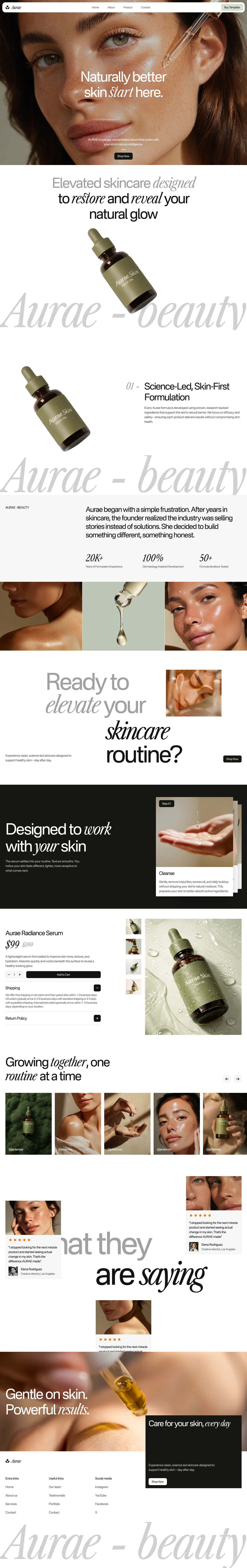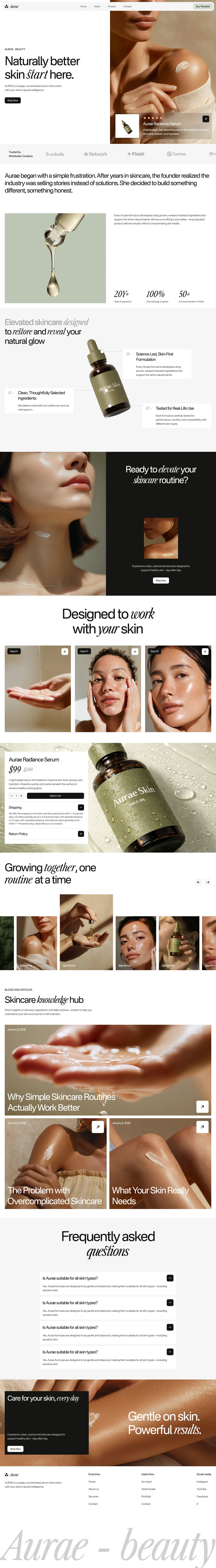 The Aurae template is a modern and elegant solution for skincare and beauty brands aiming to create a strong online presence. This type of template is valuable for its ability to combine aesthetic appeal with functional design, making it ideal for showcasing products and engaging with customers.