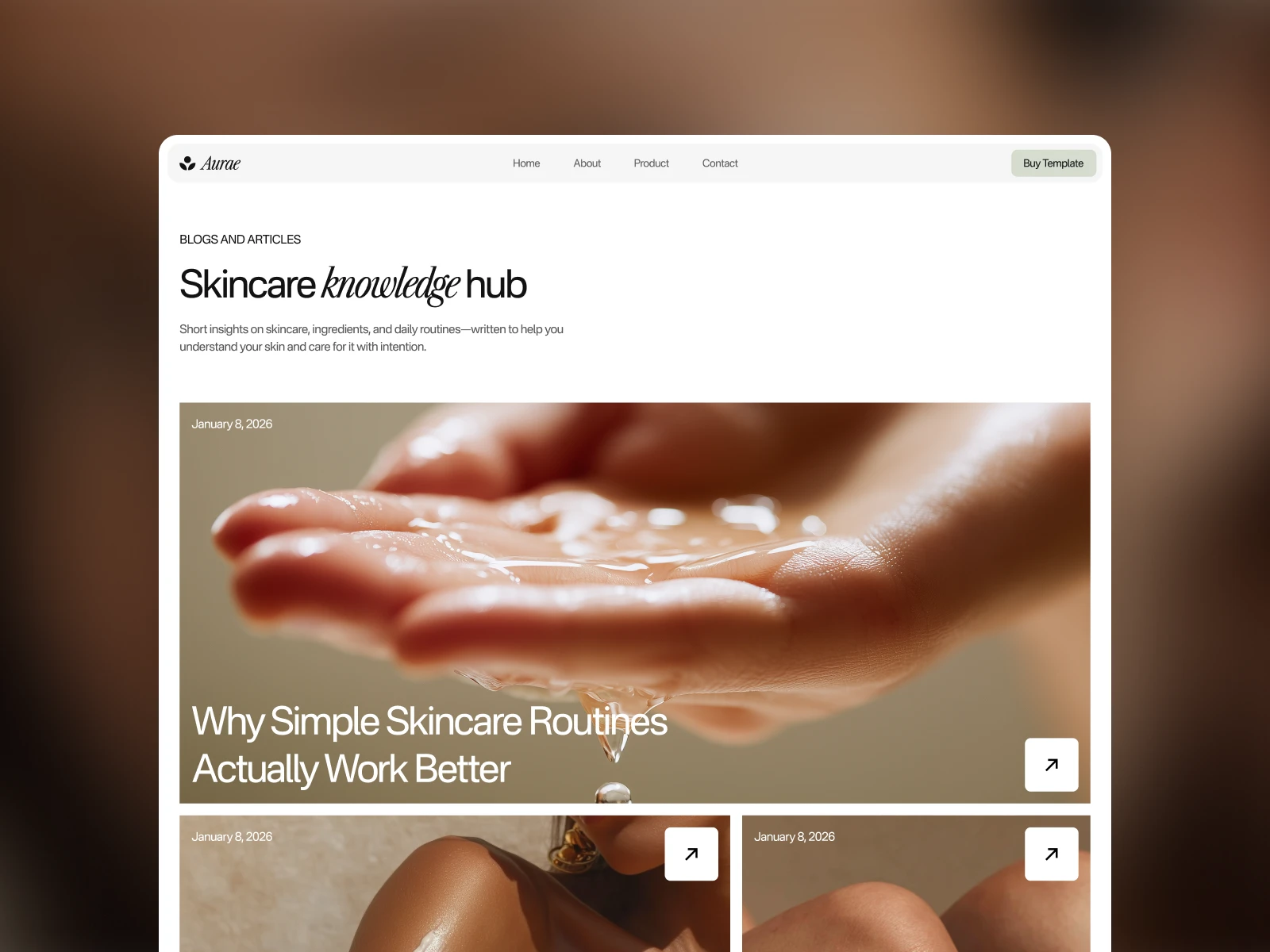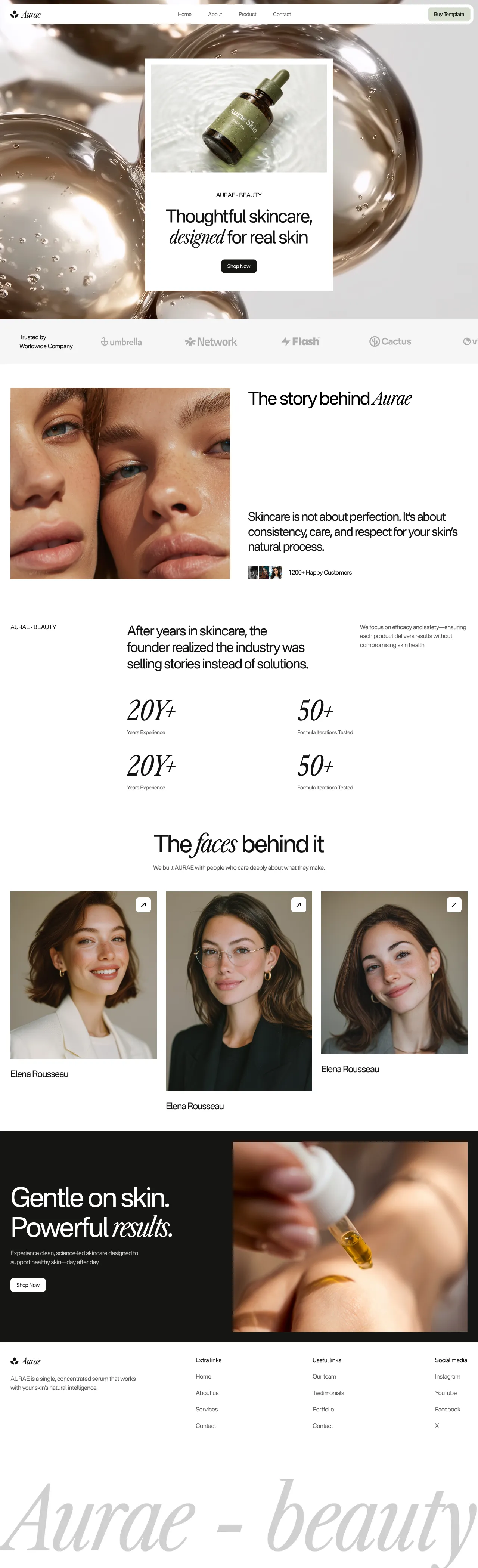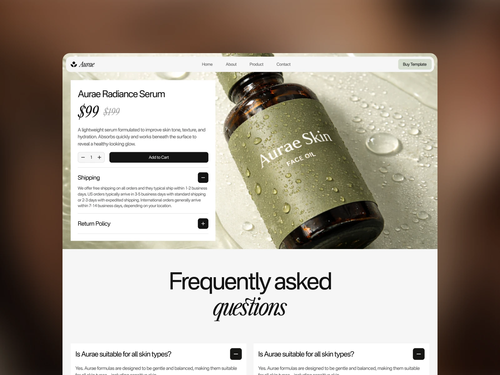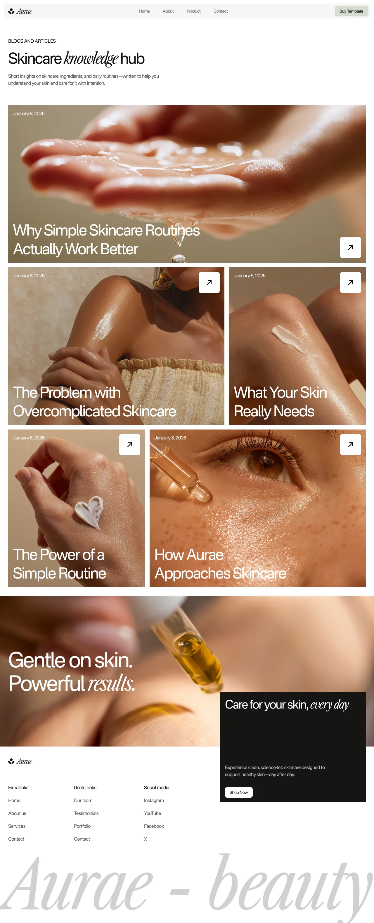 The Aurae template is a modern and elegant solution for skincare and beauty brands aiming to create a strong online presence. This type of template is valuable for its ability to combine aesthetic appeal with functional design, making it ideal for showcasing products and engaging with customers.