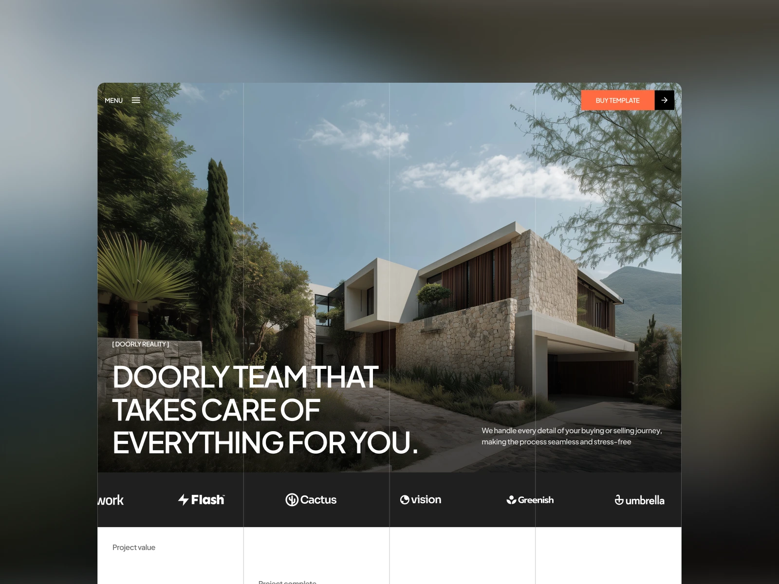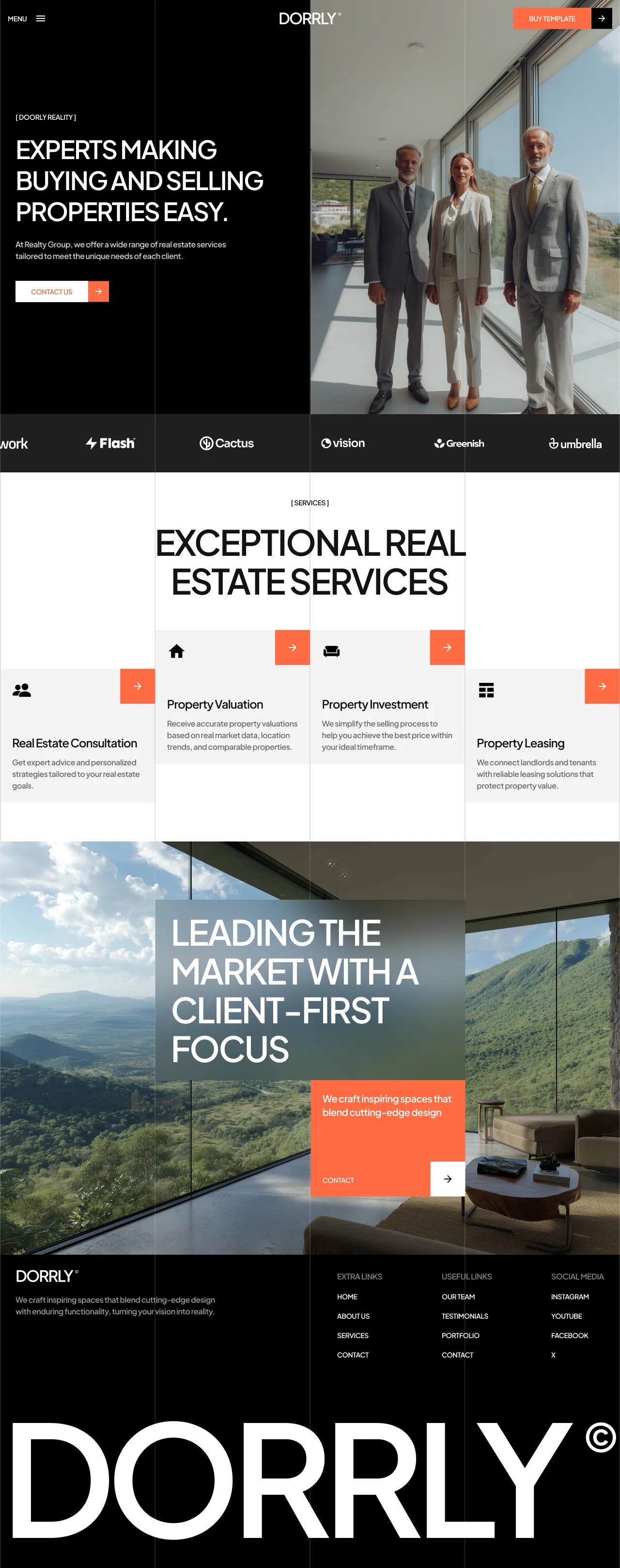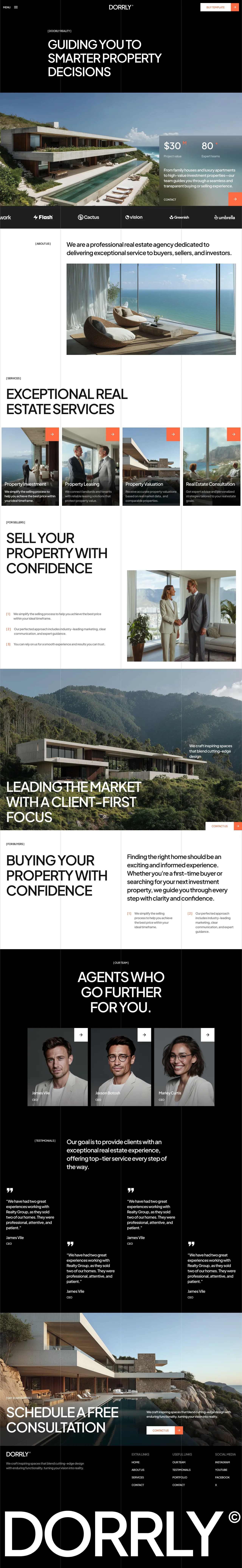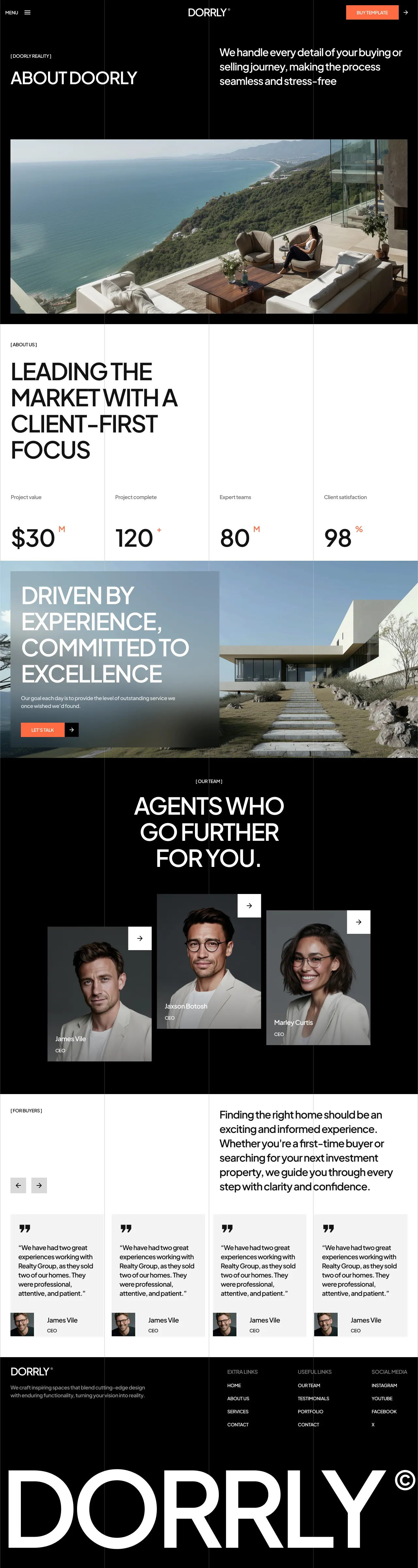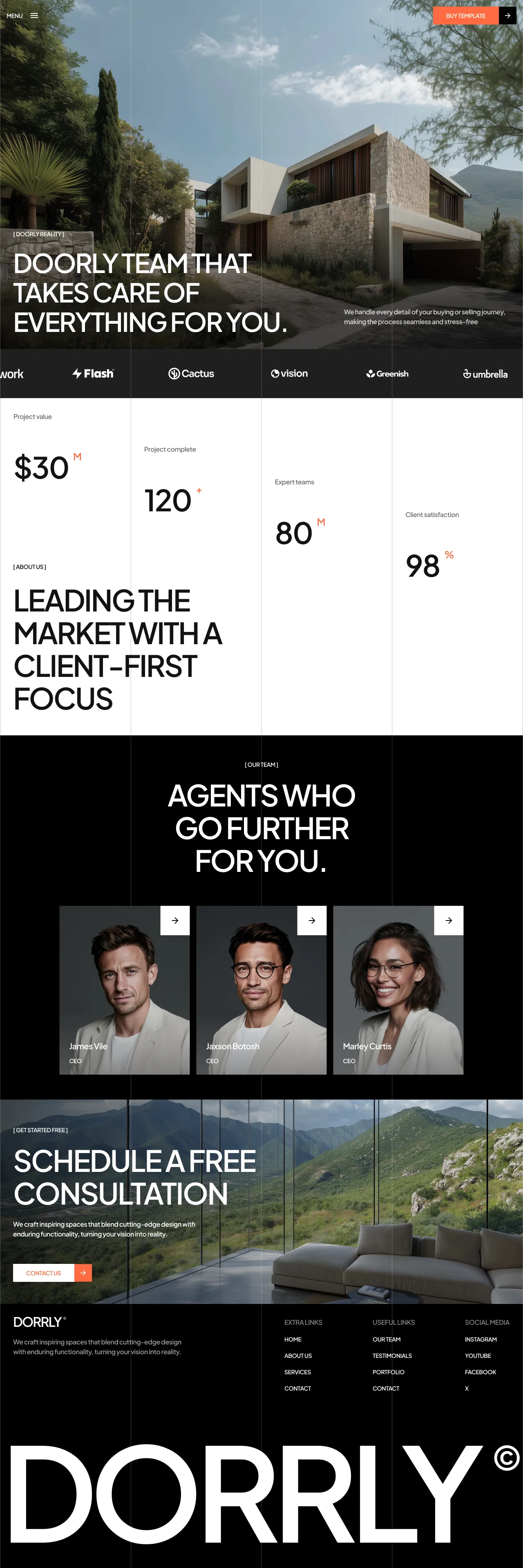 The visual elements of Doorly include a sleek, modern design with large, high-quality images and a clean layout. The homepage features a striking hero section with a bold headline and a call-to-action button, setting the tone for the rest of the site. The template includes sections for showcasing properties, detailed service offerings, and team introductions, all designed to build trust and credibility.