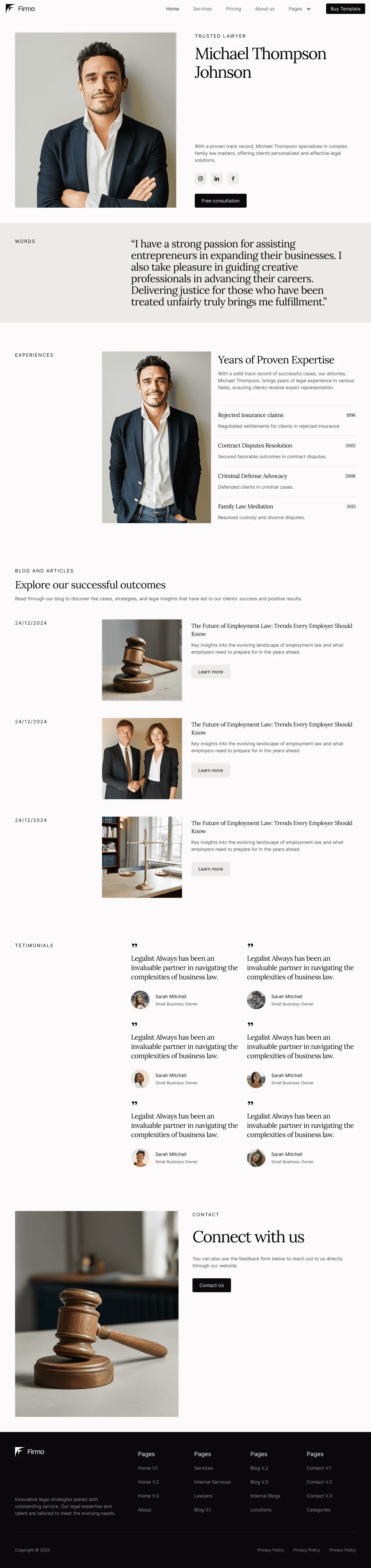 With a clean and sleek design, Firmo includes editable sections to highlight a wide range of services, case studies, or practice areas. Whether you’re promoting family law, corporate legal services, or real estate expertise, this template provides the tools you need to effectively communicate your value and attract potential clients.