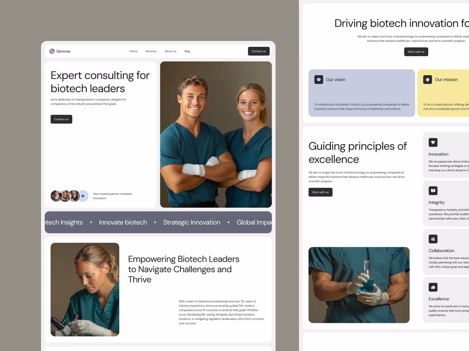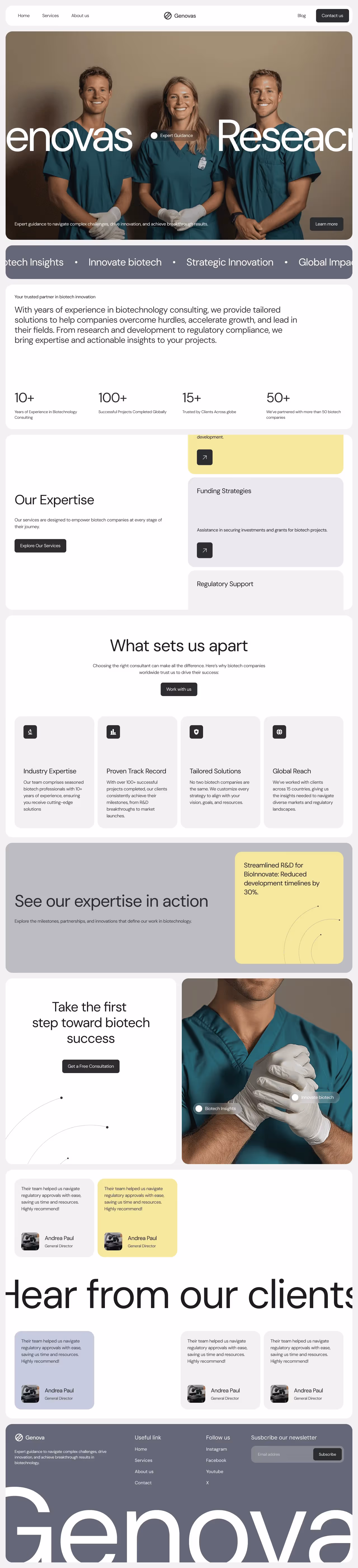 Genovas is a sleek and professional Webflow template designed for biotech consultants and healthcare innovators. Perfect for firms in research, regulatory affairs, or strategic planning, it includes dynamic CMS for blog articles and service listings, contact and about pages, and a clean UI that builds trust. Genovas empowers you to showcase your expertise and engage clients through tailored layouts, smooth interactions, and responsive design.