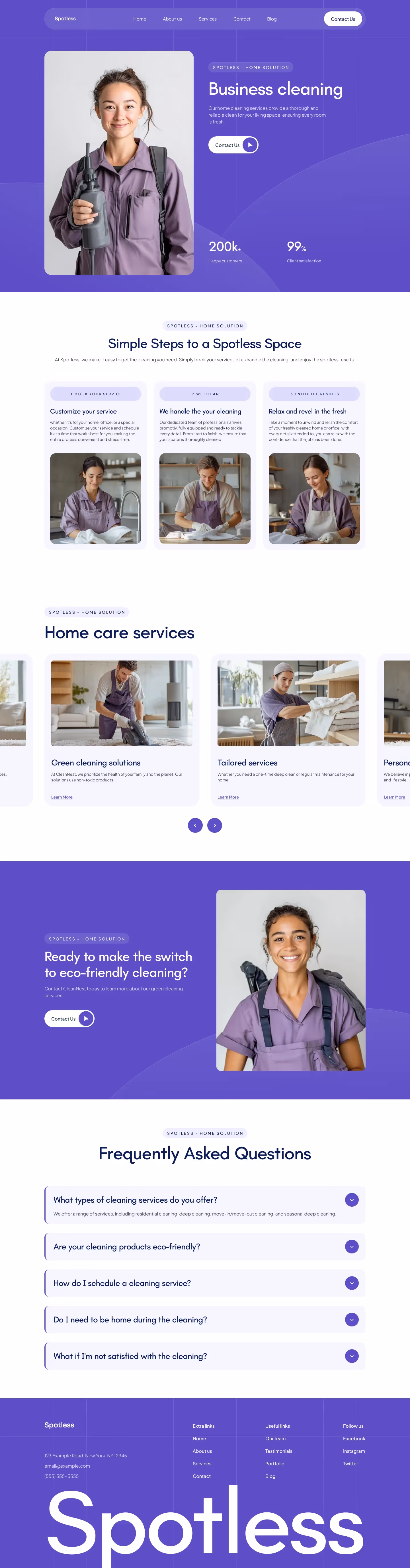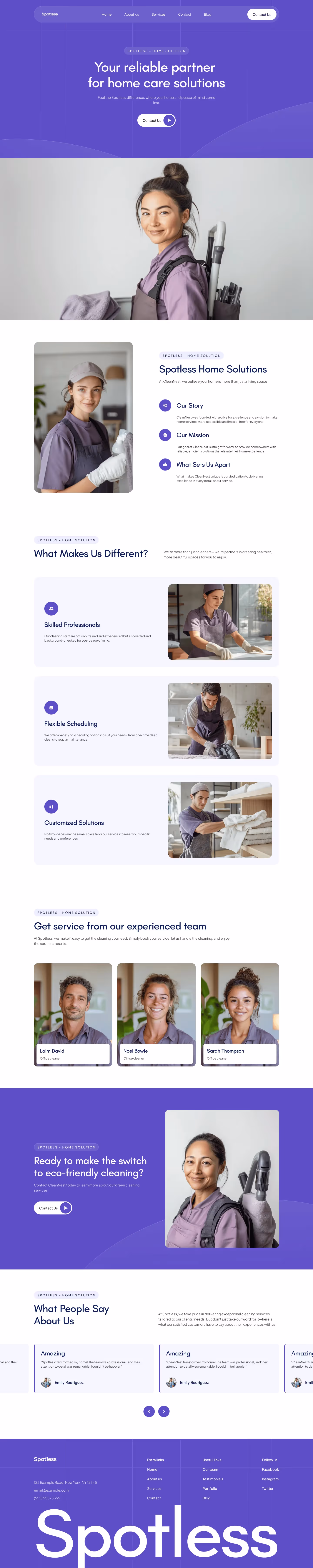 Spotless is a Webflow template meticulously crafted for cleaning service professionals and businesses aiming to establish a modern and trustworthy online presence. Ideal for residential, commercial, and specialized cleaning services, Spotless offers a flexible and customizable structure, allowing you to easily adapt all components to meet your business needs.