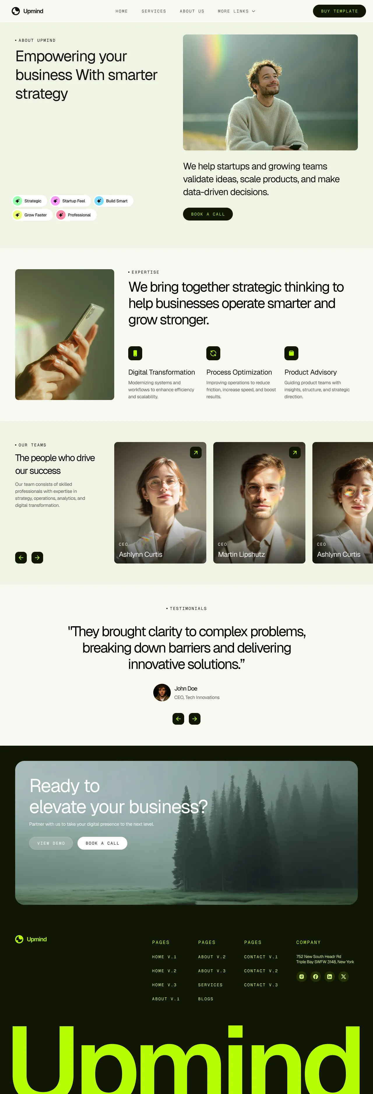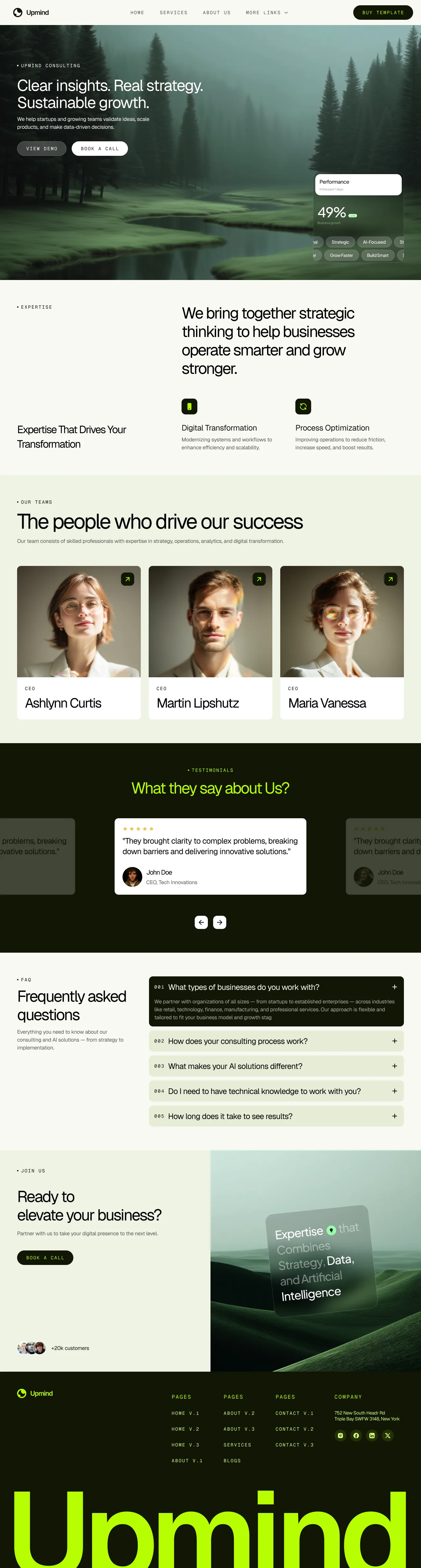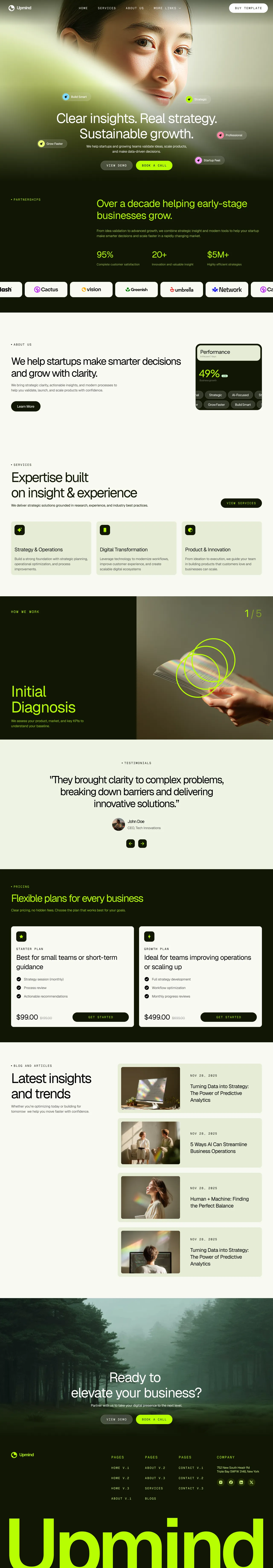 The 'Upmind' template is a versatile and modern website template tailored for consulting firms and businesses aiming to showcase their strategic growth solutions. This type of template is invaluable for businesses that want to present their expertise and services in a professional and engaging manner.